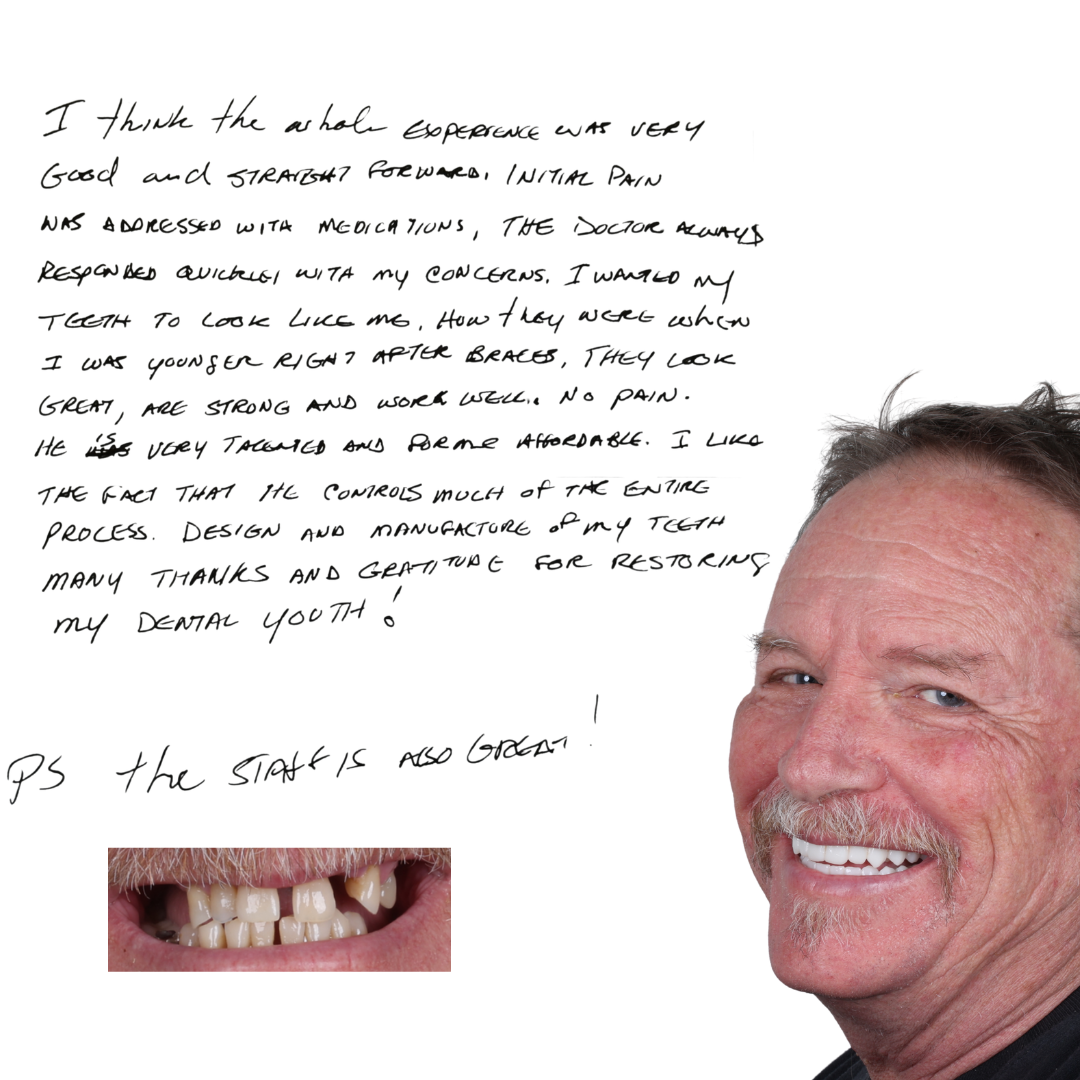 Imagine walking into our office in the morning with a mouth full of broken down, worn out, or missing teeth… and a few hours later walking out with a brand new smile that looks amazing, is rock solid for chewing, and never needs to be removed.